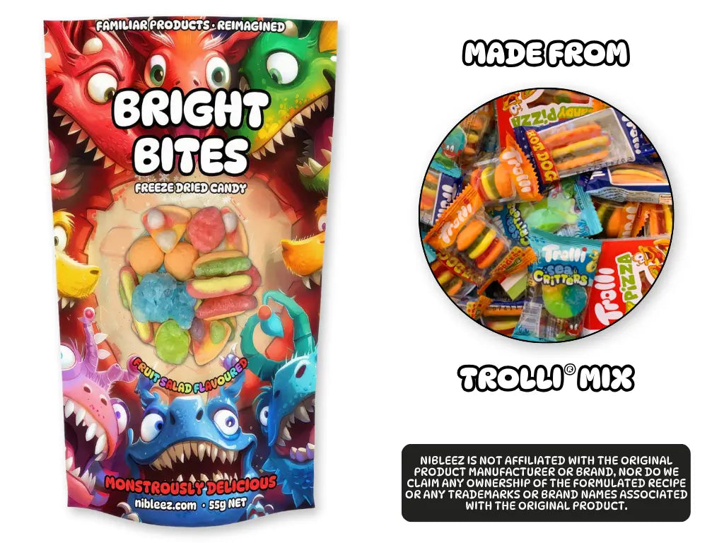 Our Bright Bites (made from freeze dried Candy Hot Dogs, Candy Pizzas, Candy Burgers, and Gummy Sea Critters) are a very popular freeze-dried product! By removing every bit of moisture from the candy, it becomes crunchy, while retaining every bit of flavour! For the candy connoisseur, you don't want to miss out on these! You simply need to try them!