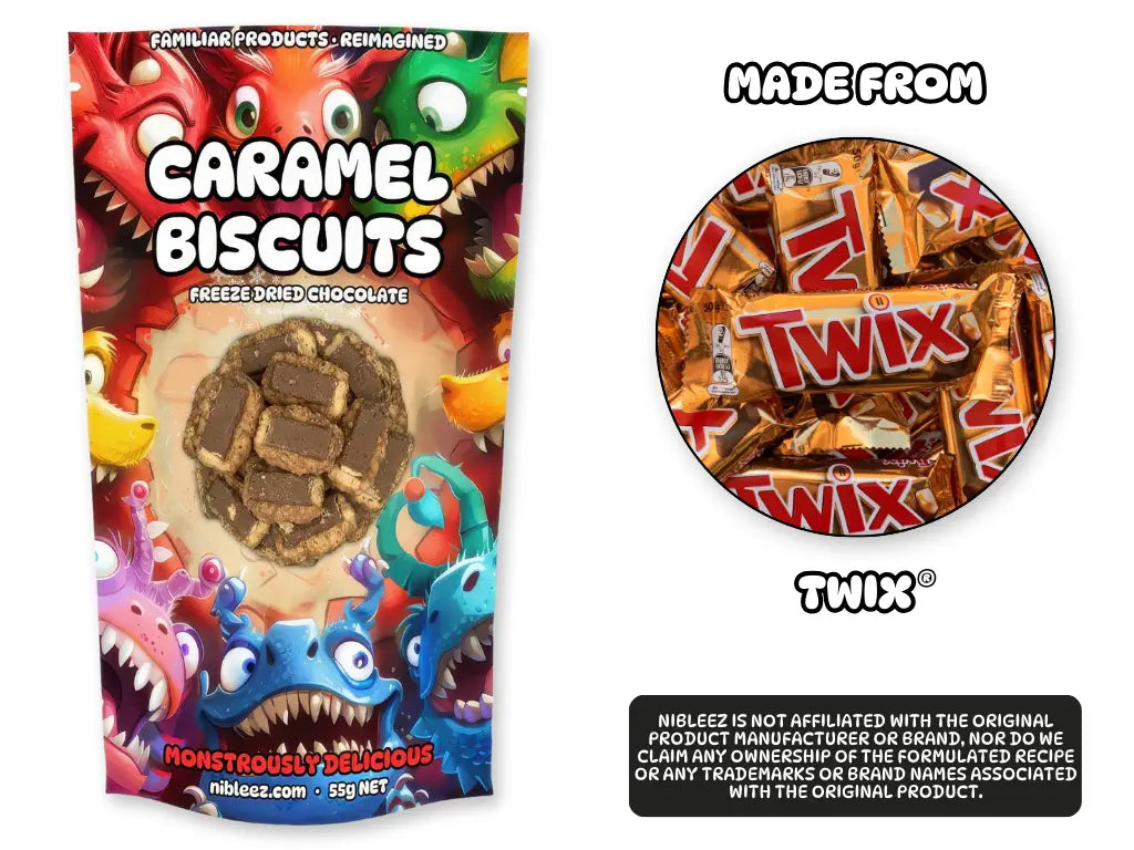 Our Caramel Biscuits (made from freeze dried Twix) are a texture fiesta. By removing every bit of moisture from the candy, it becomes crumbly and crispy, while retaining every bit of flavour! The chocolate coating further enhances the flavour and texture! You should definitely give these a try!