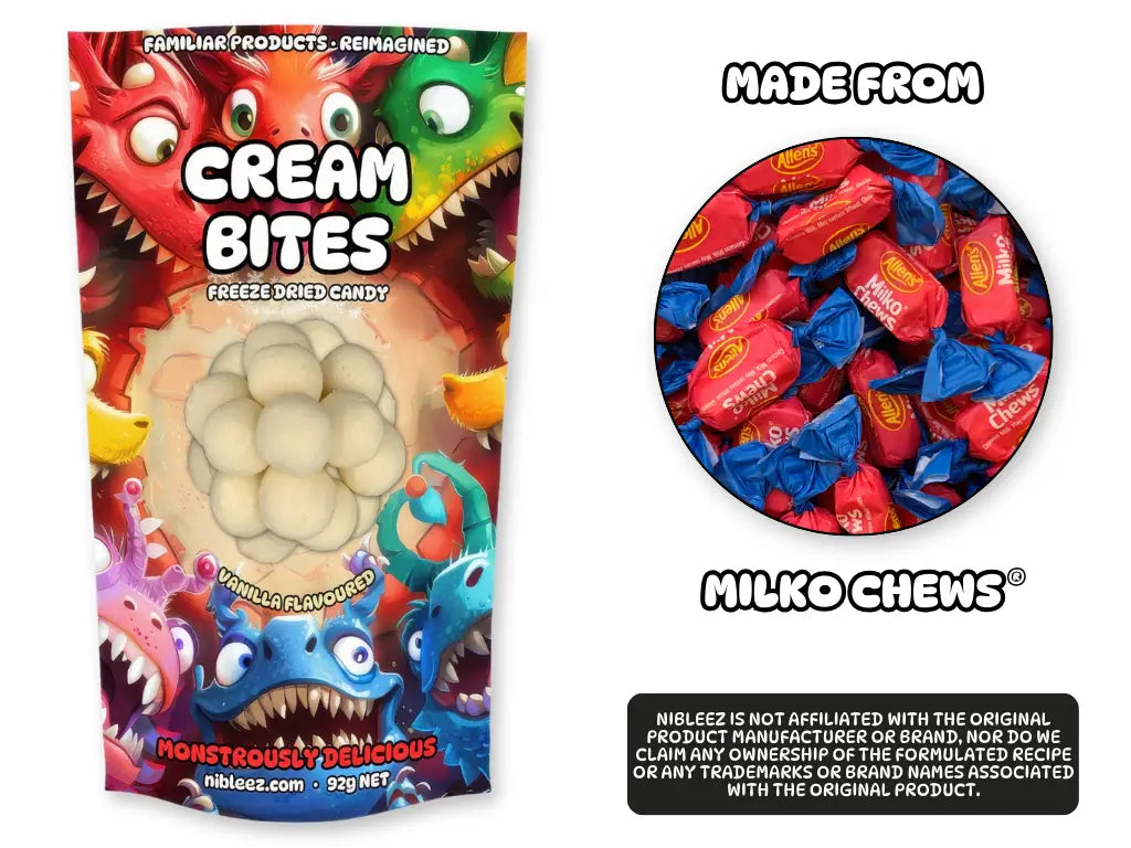 Our Cream Bites (made from freeze dried Milko Chews) are packed with flavour. By removing every bit of moisture from the candy, it becomes crisp and crunchy! For the candy connoisseur, these cannot be missed! You simply need to try them!