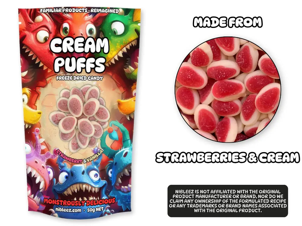 Our Cream Puffs (made from freeze dried Strawberries & Cream) are one of the most popular freeze-dried products on the market! By removing every bit of moisture from the candy, it becomes crisp and crunchy, while retaining every bit of flavour! For the candy connoisseur, these are among the best of the best! You simply need to try them!