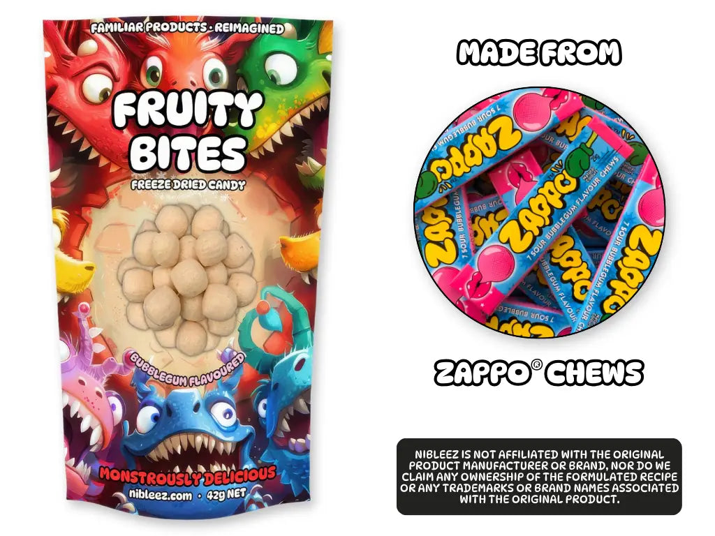 Our Fruity Bites (made from freeze dried Zappo Chews) are a flavour fiesta. The electrifying bubblegum flavour bursts forth in every bite. Texturally, they are ultra-light and crunchy with a chalky meringue consistency that crumbles in your mouth. Created specifically to remove chew fatigue, this product will positively energise your salivary glands and invigorate your taste buds! Grab yours today and experience the amplified flavour and crazy texture.