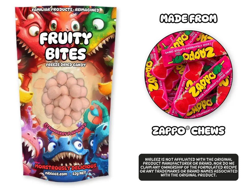 Our Fruity Bites (made from freeze dried Zappo Chews) are a flavour fiesta. By removing every bit of moisture from the candy, it becomes crisp and crunchy, while retaining every bit of flavour! For the candy connoisseur, these are sure to tantalise your taste buds! You simply need to try them!