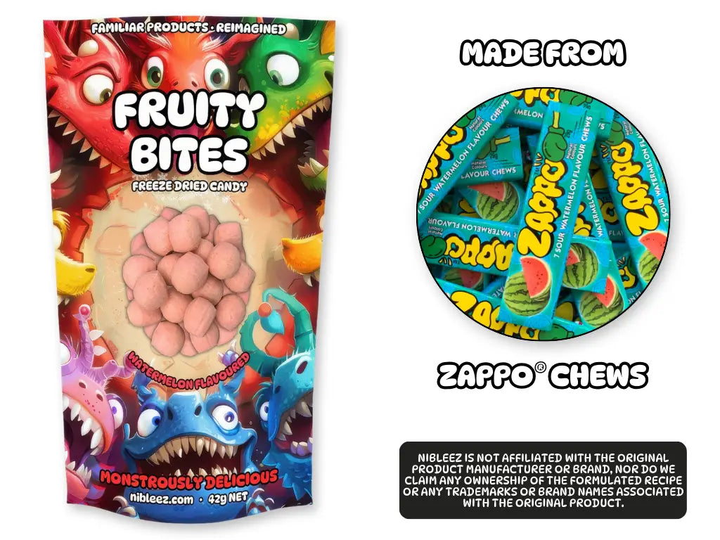 Our Fruity Bites (made from freeze dried Zappo Chews) are a flavour fiesta. By removing every bit of moisture from the candy, it becomes crisp and crunchy, while retaining every bit of flavour! For the candy connoisseur, these are sure to tantalise your taste buds! You simply need to try them!