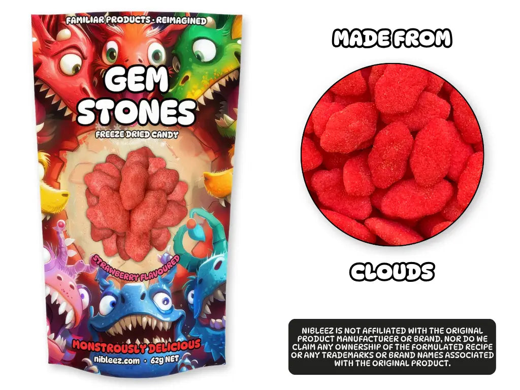Our Strawberry Gem Stones (made from freeze dried Strawberry Clouds) are a popular product with a serious crunch! By removing every bit of moisture from the candy, it becomes light and crispy, while retaining every bit of flavour! For the candy connoisseur, these are a unique experience! You simply need to try them!