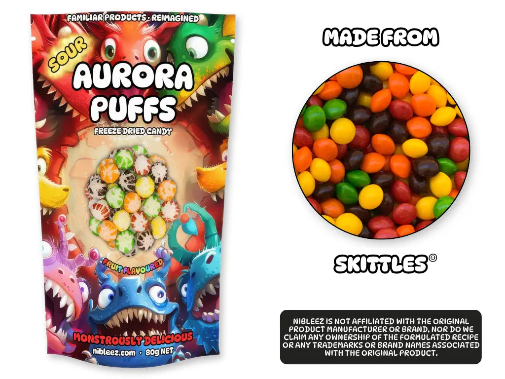 Sour Aurora Puffs (made from freeze dried Sour Skittles) are one of the most popular freeze-dried products on the market! By removing every bit of moisture from the candy, it becomes crisp and crunchy, while retaining every bit of delicious fruity flavour! For the candy connoisseur, these are the pinnacle of sugary goodness! You simply need to try them!