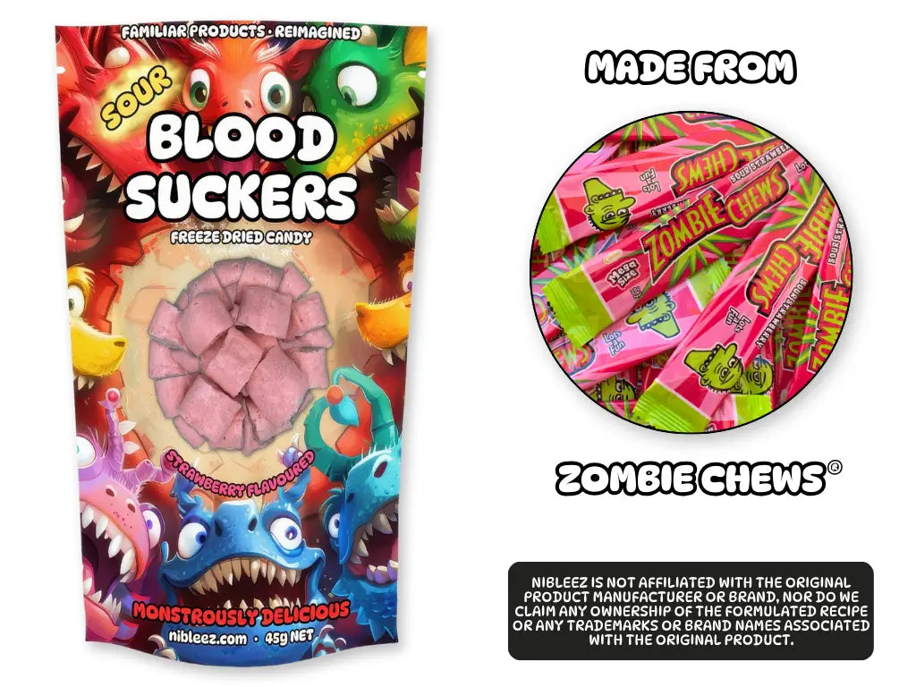 Sour Blood Suckers (made from freeze dried Zombie Chews) come in a range of delicious sour flavours that will test the resilience of your palate. By removing every bit of moisture from the candy, it becomes crisp and crunchy, while retaining every bit of flavour and boosting the impact of the sour ingredients! For the sour candy connoisseur, these will certainly test you! You simply need to try them!