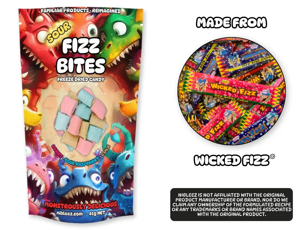 Sour Fizz Bites (made from freeze dried Wicked Fizz) come in a range of delicious sour flavours that will test the resilience of your palate. By removing every bit of moisture from the candy, it becomes crisp and crunchy, while retaining every bit of flavour and boosting the impact of the sour ingredients! For the sour candy connoisseur, these are sure to tantalise your taste buds! You simply need to try them!