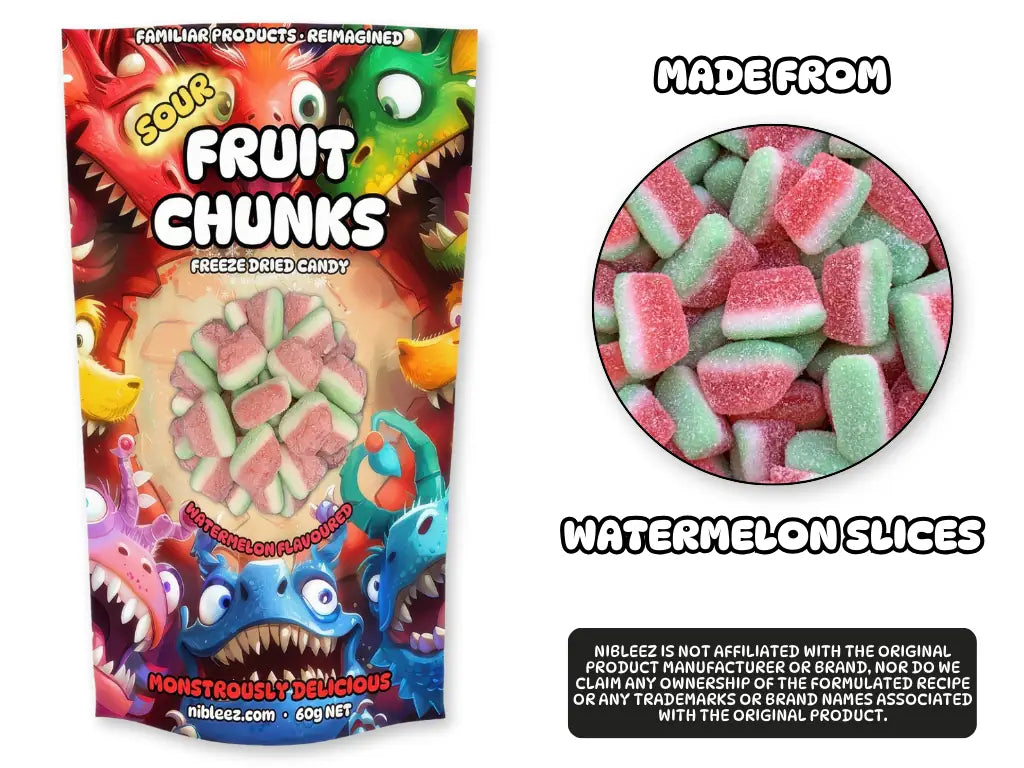 Our Watermelon Sour Fruit Chunks (made from freeze dried Sour Watermelon) are a popular freeze-dried product with a serious crunch! By removing every bit of moisture from the candy, it becomes light and crispy, while retaining every bit of flavour! For the candy connoisseur, these are a unique experience! You simply need to try them!