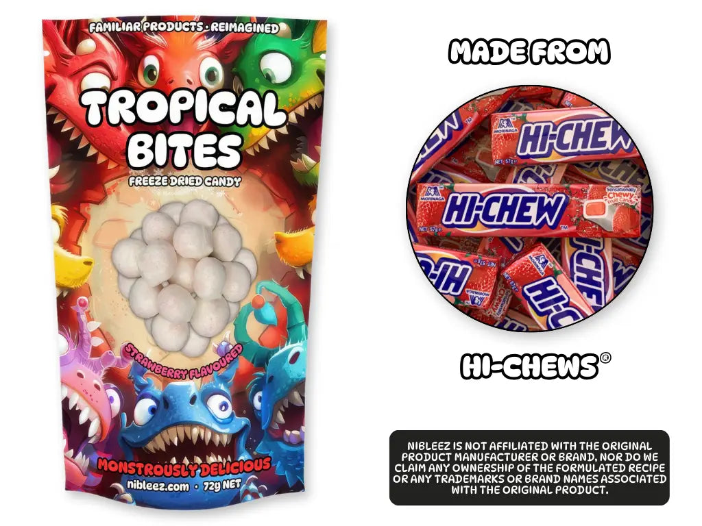 Our Tropical Bites (made from freeze dried Hi-Chews) is a combination of two similar products that contain natural ingredients. By removing every bit of moisture from the candy, it becomes crisp and crunchy, while retaining every bit of flavour! For the candy connoisseur, these cannot be missed! You simply need to try them!